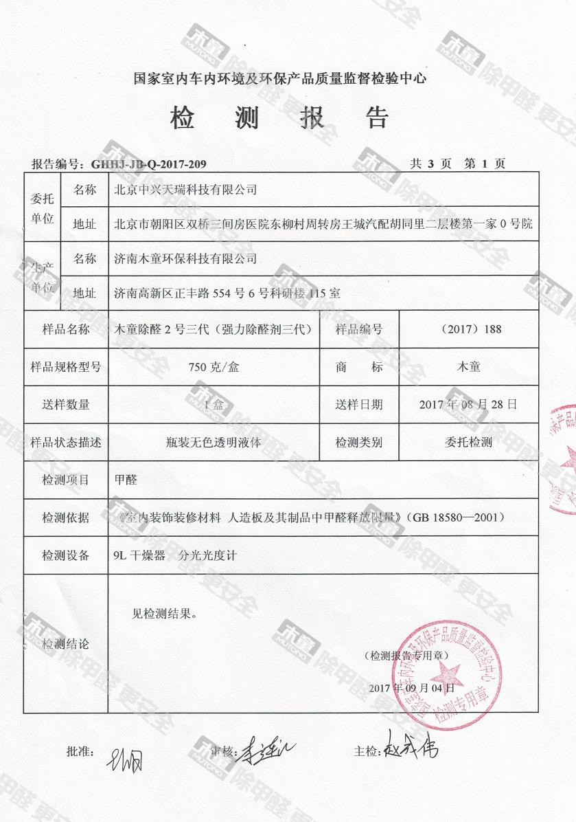 木童除醛2號三代效果檢驗(yàn)報(bào)告2017